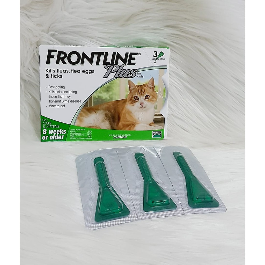 Bahan aktif Fipronil dalam Frontline Plus mampu cepat larut ke dalam minyak alami kulit kucing dan terus masuk dari folikel bulu ke kulit sampai30 hari kedepan dengan perlindungan penuh. Frontline for Cat Frontline juga merupakan obat kutu yang sangat populer. Satu kotak Forntline berisi 3 tube untuk tiga kali pemakaian.